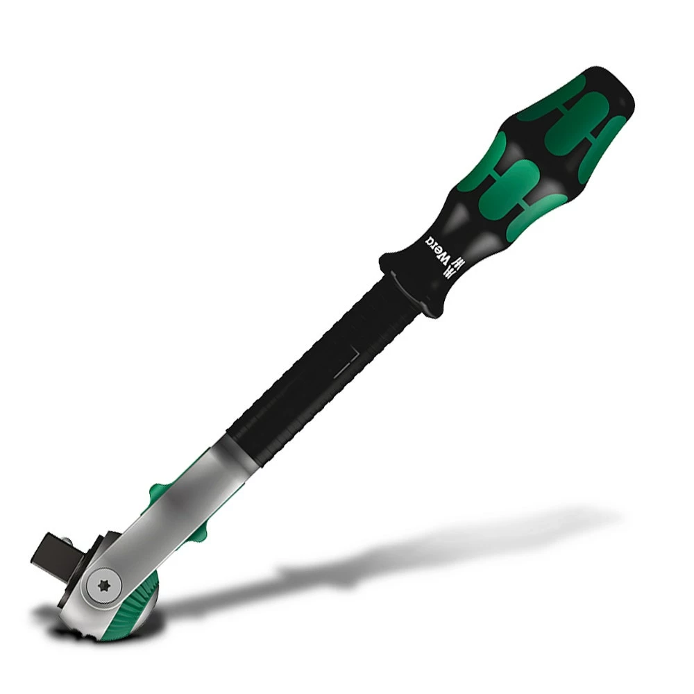 Zyklop ratchet with 1/2″drive. The 72 fine-pitched teeth enable a low return angle of only 5°. The ratchet head pivots freely and can be locked into any position by using the slide switch that is positioned on either side. It is even possible to work conveniently in very confined and difficult-to-access areas with enhanced hand clearance. The predefined locking positions at 0°, 15° und 90°, both to the right and left, ensure safe working without any slipping of the ratchet head. The ratchet can be used as a conventional screwdriver in the 0° position by attaching an adaptor and a bit. The flywheel design ensures rapid screwdriving.
